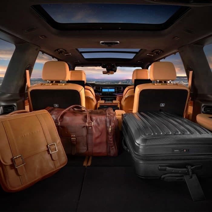 There is a full suite of standard safety features for this large SUV. Every model comes with driver aids such as forward collision warning and automatic braking, a blind-spot monitor, parking sensors, a digital rearview mirror, and rear cross-traffic alert. Lane-departure warning and lane-keep assist also come standard, and every trim has adaptive cruise control, night vision with pedestrian detection and animal detection, and a self-parking feature. A semi-autonomous driving mode will be a future option for the Grand Wagoneer, allowing hands-free driving.